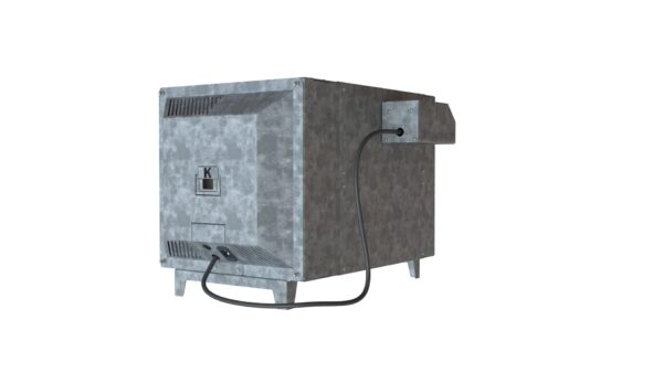 De oven is volledig opgebouwd uit thermische verzinkte plaat met Sendzimir afwerking. Een stevige rubberen rand onder het onderstel voorkomt krassen op tafel of werkbank.